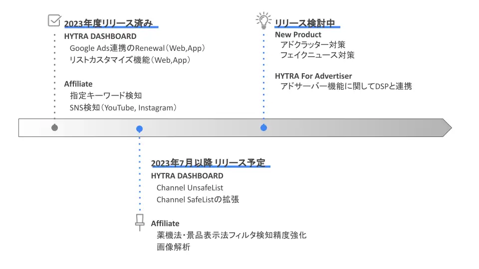 現在計画しているロードマップから一部をご紹介すると、直近では、アフィリエイト事業者に活用いただけるようなAIによる画像検知プログラムを活用した薬機法遵守のための対策や、ユーザー投稿型SNSに投稿されたテキストやURLの解析により、ブランドセーフティ対策を強化するサービスを今後ローンチする予定です。
