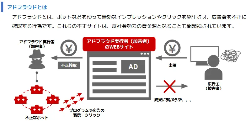 いずれも反社会的な組織の収入源となっている可能性があったり、競合他社への嫌がらせだったりと、適切な広告運用を行うためにも迅速な対策が欠かせません。