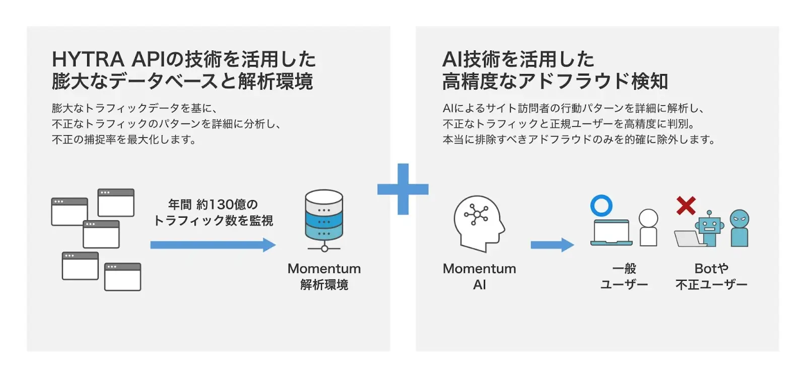 Momentumの「HYTRA HORNET」は、さまざまな媒体の広告詐欺対策が可能な解析型ツールです。DSPやアドネットワークなどの広告配信事業者向けのリスク対策サービス「HYTRA API」を長年提供しており、数多くのトラフィックデータの解析を行ってきました。 この技術と知見に加え、AI技術を活用しサイト訪問者の行動パターンを詳細に分析することで、不正なアクセスの検知率を最大限に高めています。