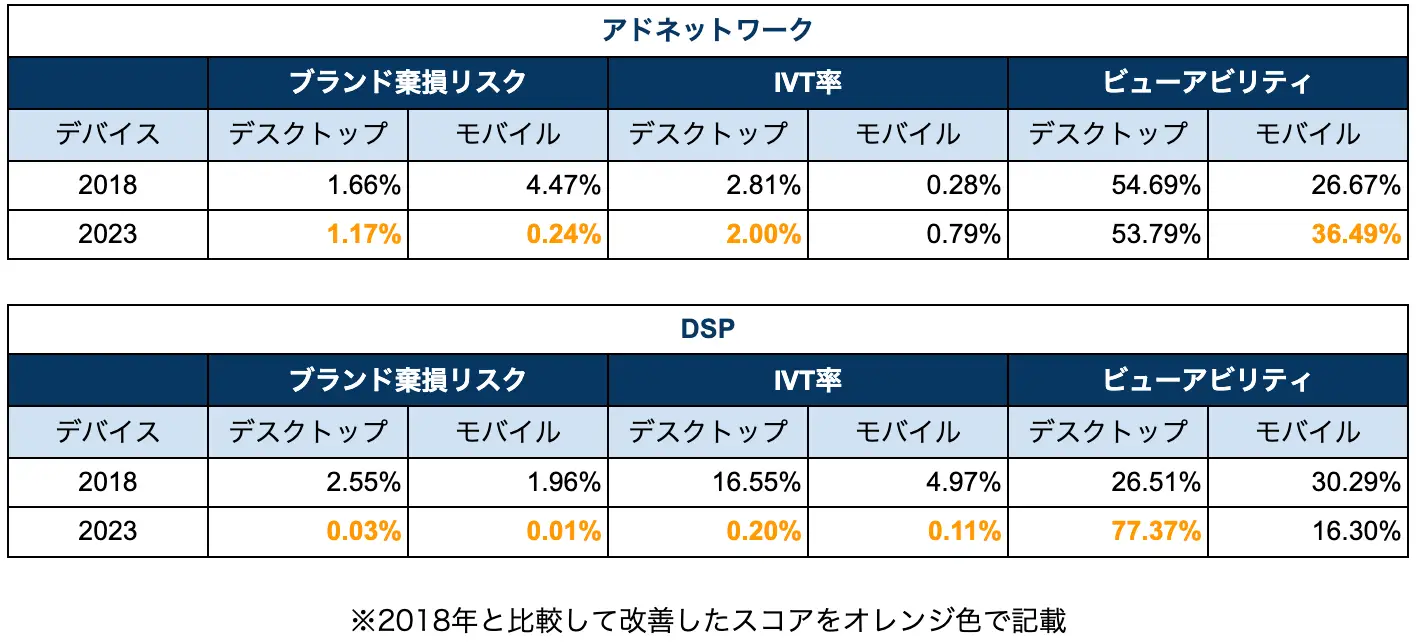オレンジ色の部分を見ていただければ、全体的には改善の傾向にあることがわかります。最も顕著なのはブランド棄損リスクです。ここ5年間で、アドネットワークとDSPの両方ともブランドセーフティ率・IVT率ともにリスクが低下しており、広告主にとって安全な配信がなされる環境が実現しています。
