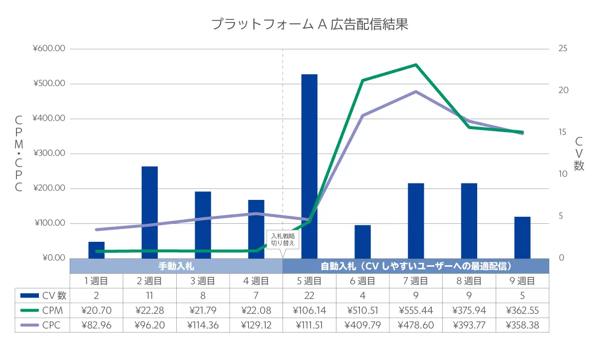 自動入札に切り替えた後の方が、顧客が獲得できています。刈り取りに重点をおいた結果、CPMとCPCは悪化していますが、これを許容できるかどうかは、広告主が設定しているKPIやCPA次第です。
