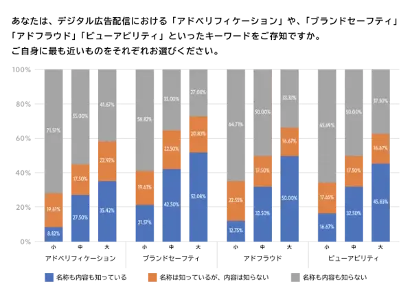 Q.あなたは、デジタル広告配信における「アドベリフィケーション」や、「ブランドセーフティ」「アドフラウド」「ビューアビリティ」といったキーワードをご存知ですか。ご自身に最も近いものをそれぞれお選びください。