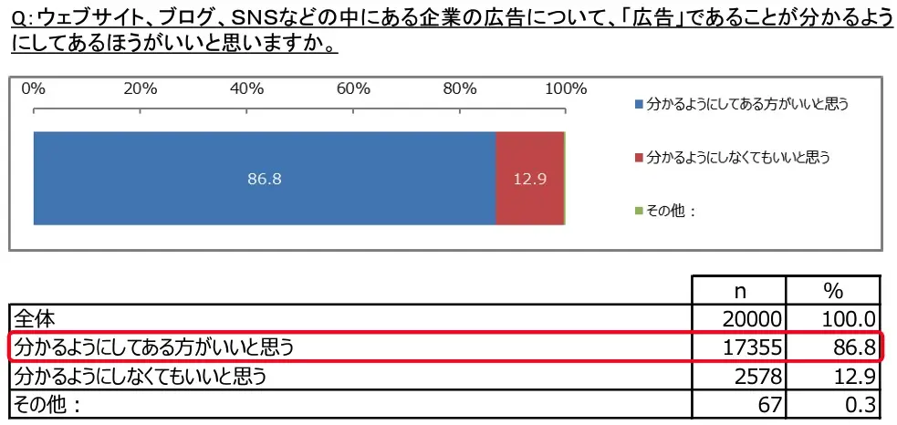 アフィリエイト広告の問題点として、消費者がアフィリエイト広告かどうか見た目で判別できない点も懸念されています。一部のアフィリエイト広告では、リンク先で商品購入などをすると代金の一部が報酬として支払われることが明示されていることもありますが、一般的ではありません。なお消費者庁が行った実態調査の結果によると、広告だと明示してあるほうがいいと思う消費者は以下のとおり86.8%にのぼりました。