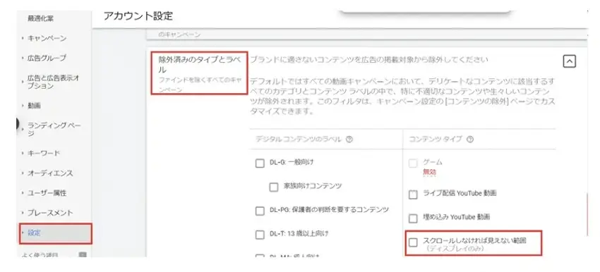 この除外機能は、ビューアビリティに対して効果があります。除外済みのタイプとラベルの中に「スクロールしなければ見えない範囲(ディスプレイのみ)」というものを選択できます。これによりディスプレイ面のビューアビリティを向上させることが期待できます。