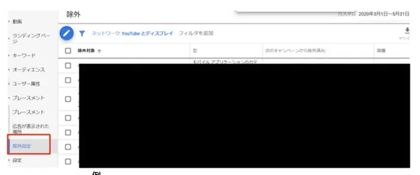 Google Adsの管理画面左のメニューの中から「プレースメント」をクリックすると「除外設定」という画面に遷移します。