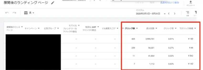 アドフラウドが発生したかは、ランディングページの関連レポートから検証することができます。指標としてはインプレッション、クリック数、CTR、コンバージョン、CVR、CPAを参考にします。