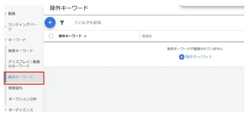 Google Adsの管理画面左のメニューの中から「キーワード」をクリックすると「除外キーワード」を登録できる画面に遷移します。