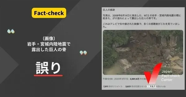 ファクトチェックを専門とする日本ファクトチェックセンター(JFC)による検証の結果、投稿された画像は、NHKが放送した2008年6月の岩手・宮城内陸地震がけ崩れ現場の映像と、吉野ヶ里遺跡で発掘された人骨の画像を合成したフェイク画像である可能性が高いことが判明しました。