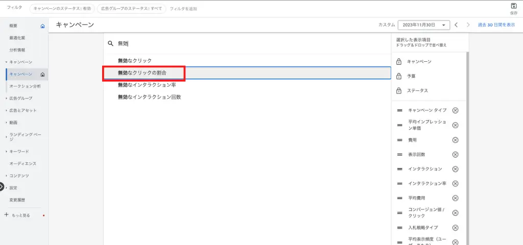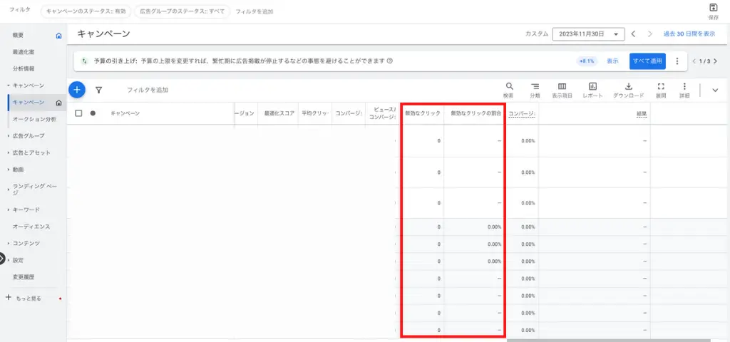 キャンペーンに戻ると、「無効なクリックの割合」に関する項目が追加されているため、発生しているクリックのうち何割が無効クリックだったかを把握することができます。