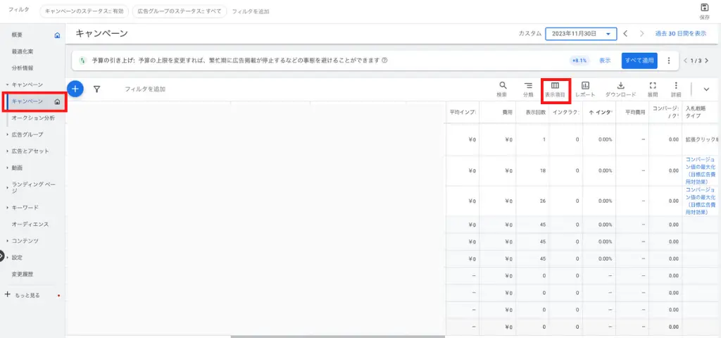 表示されたキャンペーン一覧の上にある「表示項目」アイコンをクリックし、続いて「表示項目を変更」をクリックしましょう
