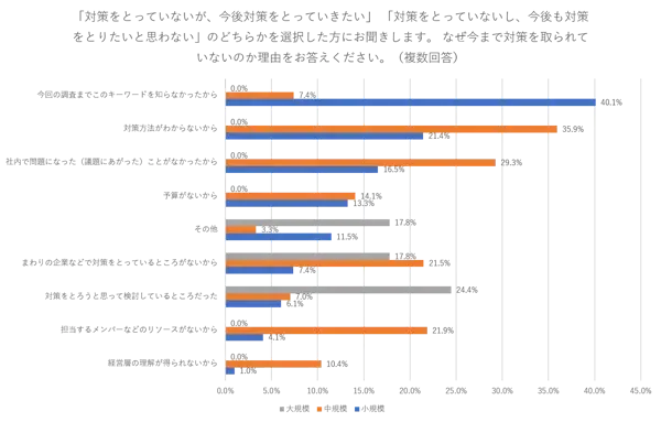 小規模の広告代理店に関しては、「今回の調査までこのキーワードを知らなかったから」という回答が40%を超え最も多く、中規模の広告代理店の理由として目立ったのが、「対策方法が分からないから」「社内で問題になった(議題にあがった)ことがなかったから」という、そもそも知らないという結果になりました。比べて、大規模広告代理店は、認知はさてれおり、「対策を検討している最中」という回答が最多でした。