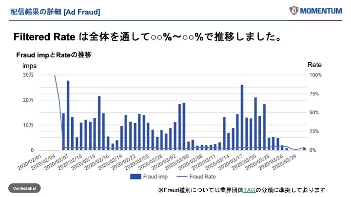レポート納品後、そのレポートをもってさらに次の対策を検討していく、という流れになります。たとえば、レポートから配信除外リストを作成したり、アドフラウドと思われるIPアドレスをブロックしたりする、という形です。基本的には単発のご利用はお勧めしておらず、長期的に計測し、徐々にリスクを下げていくことをゴールとしている場合が多いです。