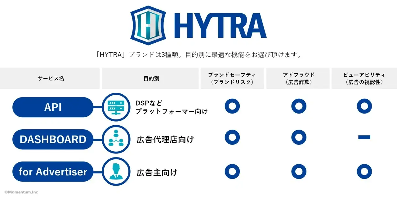 HYTRA for Advertiser を一言で説明すると、第三者配信機能を使ったアドベリフィケーションサービスです。 まず、このサービスが出来た背景から説明します。 前提として、MomentumではHYTRAというブランドにおいてサービスを展開しています。