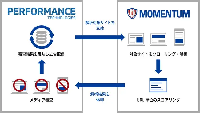 「HYTRA ANALYTICS for Ad Platform」は、提供されたURLのリストから、Webコンテンツの取得と評価を行い、ブランドセーフティ観点でのスコアリングを行います。これにより、Performance Technologiesは、自社と接続しているメディアのチェックおよび、これから取引が開始される予定のメディアの審査を、ブランドセーフティ観点から行うことができます。さらに、これまでマニュアルで行っていたメディア審査業務の工数削減も可能になります。広告主に対しては、すでに接続しているメディアを定期的にチェックすることにより、より質の高い広告枠を提供することが可能になります。