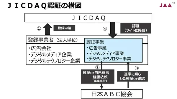 広告主は無料登録をして集め、広告代理店や配信/配信・計測ベンダーは有料で登録することとなります。そして広告代理店/配信・計測ベンダーは下記のような形で、日本ABC協会からの検証を受け、その検証結果をもってJICDAQが認証するという形になります。