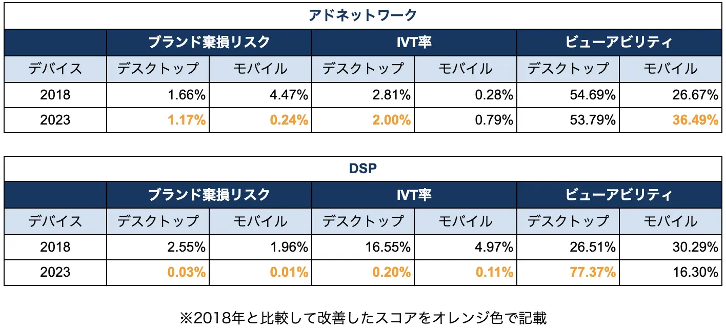 調査全体として、2018年から2023年にかけて広告配信環境は改善しており、プラットフォーム側の対策やアドベリフィケーション実施率の向上が寄与しています。ただし、 すべてのプラットフォームが同水準の安全性を確保しているわけではありません。