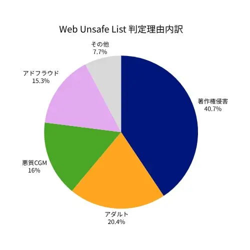 過去1年間で追加したウェブサイト・Youtubeチャンネルの内、Web Unsafe Listの40.7%、Channel Unsafe Listの59.6%が、違法アップロードや画像の無断転用が確認され「著作権侵害」と判定されたコンテンツでした。