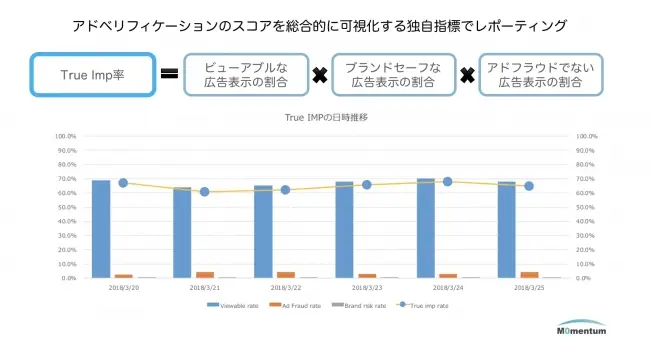 なお、レポーティングにおいては、モメンタムがブランドセーフティ、アドフラウド、ビューアビリティのスコアを総合的に可視化するため独自に開発した「True Imp率」を導入することで、、広告主のアドベリフィケーション対策を目標設定から運用・モニタリングまで一貫してサポートすることが可能です。