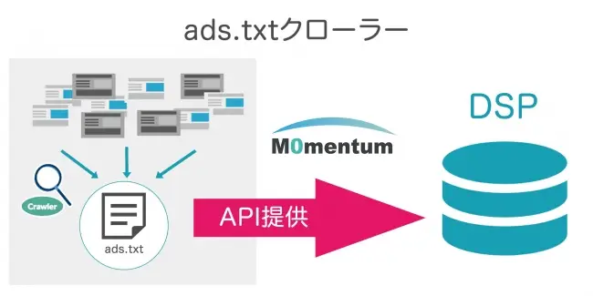 この度モメンタムが新たに提供を開始する「ads.txt」のクローリングソリューション「ads.txtクローラー」は、パブリッシャーがサイトに設置した「ads.txt」の内容をクロールし、その結果をDSPにAPIにて提供するものです。