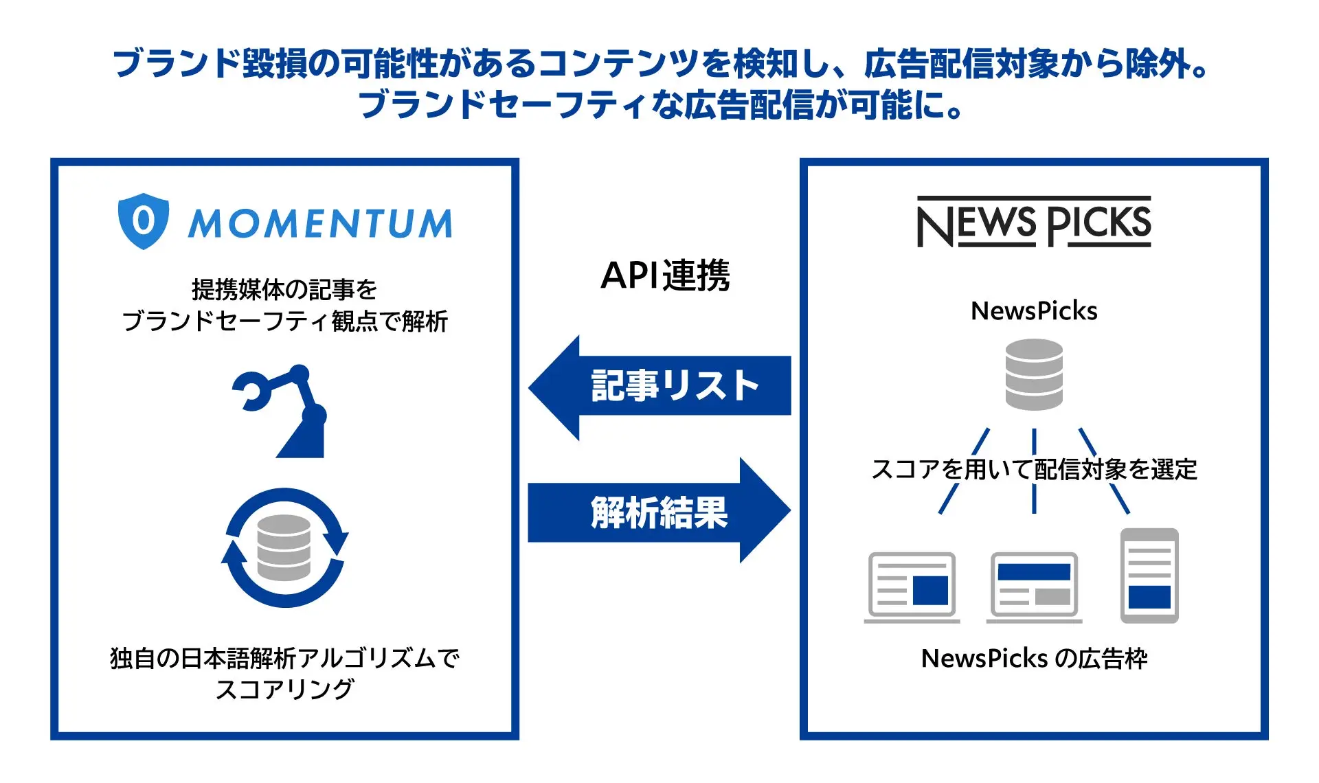 「NewsPicks」にHYTRA APIを連携させ、提携媒体の記事コンテンツをモメンタム独自の日本語解析技術によりスコアリングし、広告主のブランド毀損が懸念されるような記事には広告を表示しないよう制御することで、良質な広告枠のみを増設することができました。