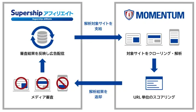 モメンタムは、日本のデジタル広告業界の健全化への取り組みを牽引する、アドベリフィケーション(※2)ソリューションカンパニーです。「無価値な広告をゼロにする」のミッションのもと、アドプラットフォーム・広告主・広告代理店など、様々な企業のニーズにあわせたアドベリフィケーションサービスを開発してまいりました。今回、Supershipの新たな事業となる成果報酬型広告プログラム「Supershipアフィリエイト」に、ブランドセーフティ観点でのURL解析サービス「HYTRA ANALYTICS for Ad Platform」の提供を開始します。