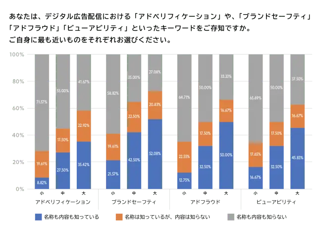 アドベリフィケーションに関わるキーワードの認知率は、企業規模によって差があることがわかりました。認知率が高い順に、大規模、中規模、小規模となります。大規模では、各キーワードの認知率は50%を超えた一方で、小規模においては内容を知らない層が約80~90%以上となりました。