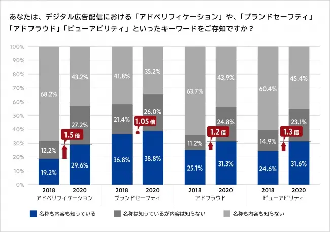 Momentumは2018年と2020年にそれぞれ、国内のアドバタイザーや代理店を対象としたアドベリフィケーション(※)についての意識調査を行っており、アドベリフィケーションに関するキーワードの認知率や、対策の実施率を調査しています。