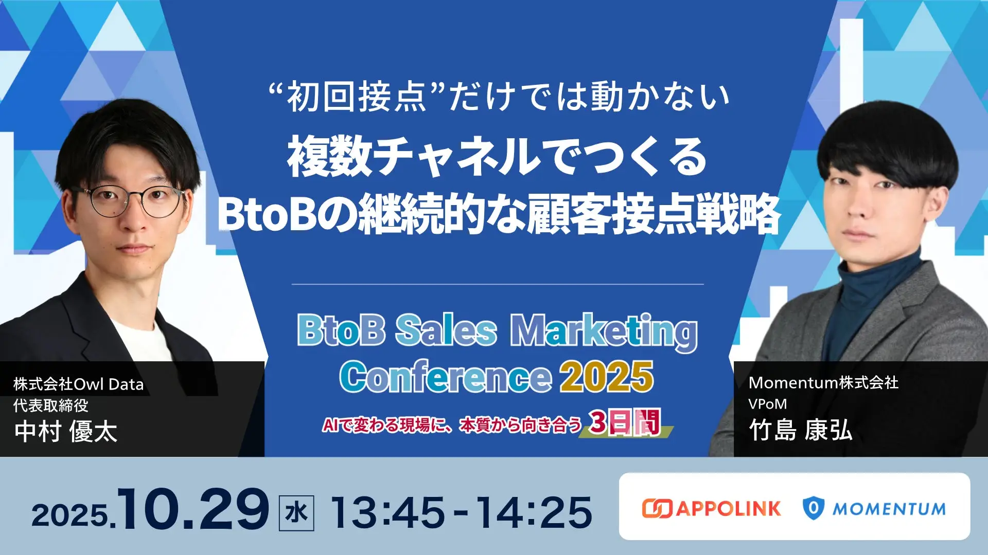 MomentumからはVPoM 竹島 康弘が、株式会社Owl Dataと「“初回接点”だけでは動かない複数チャネルでつくるBtoBの継続的な顧客接点戦略」と題したセッションに登壇いたします。